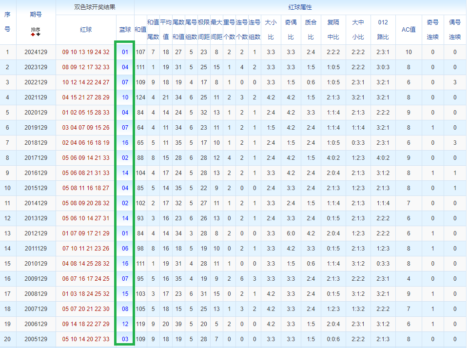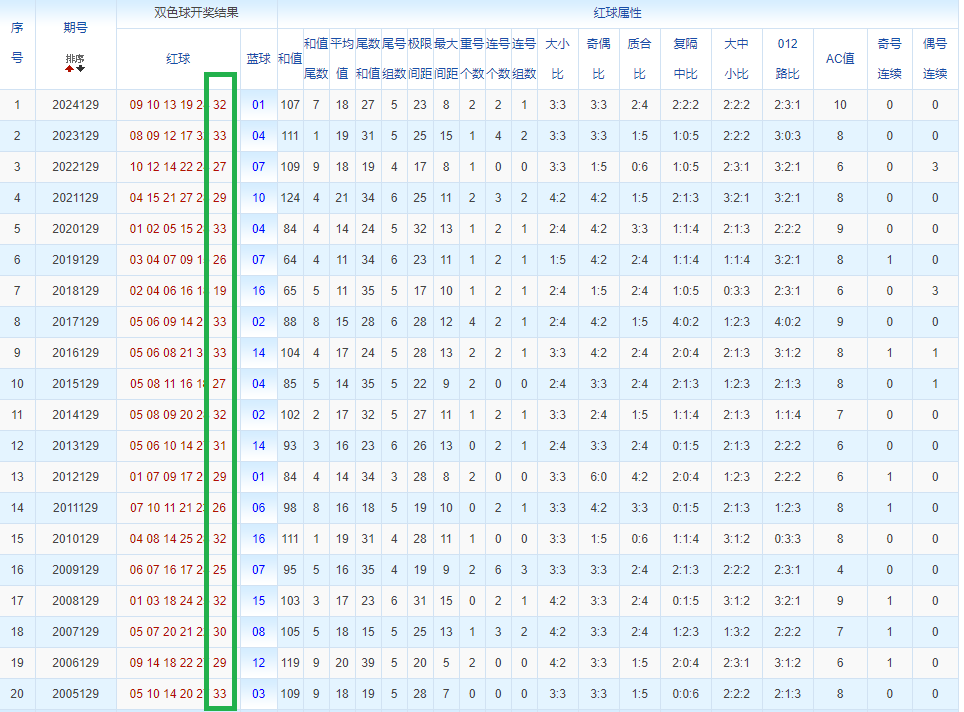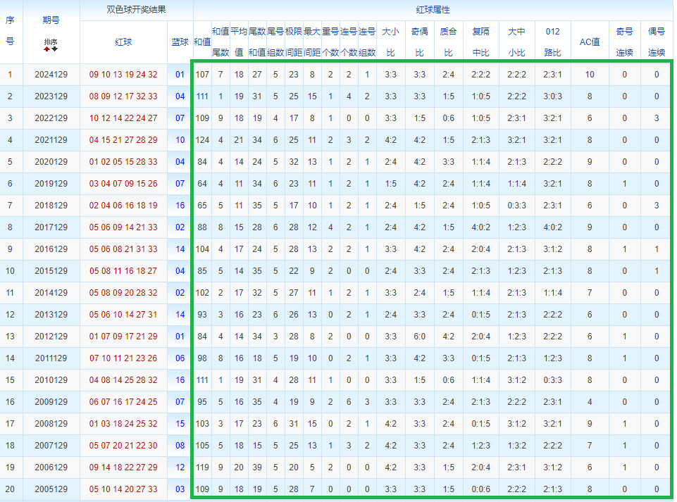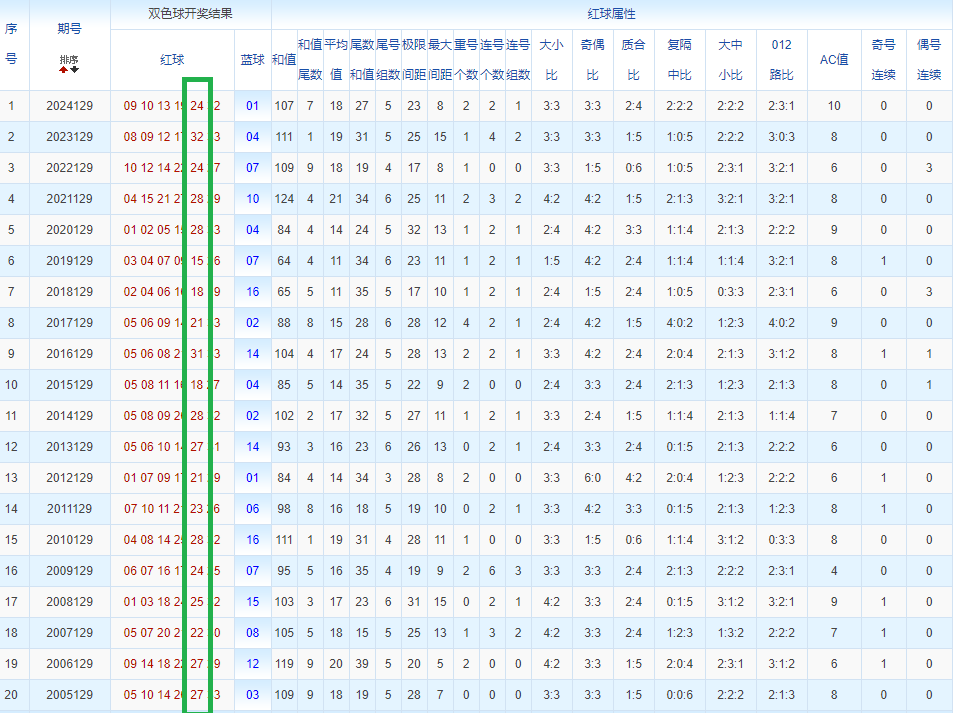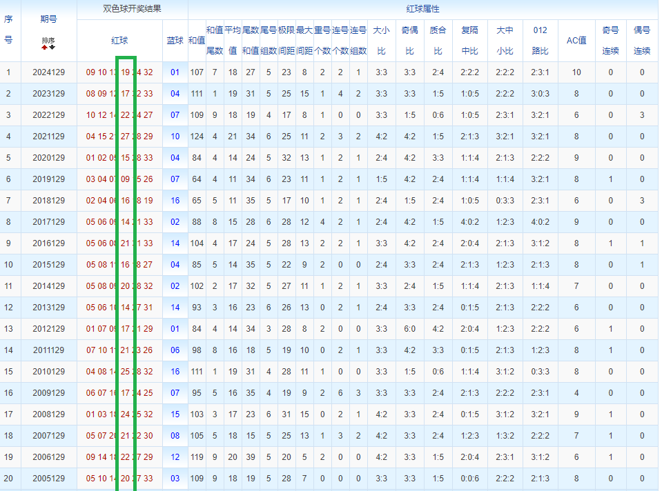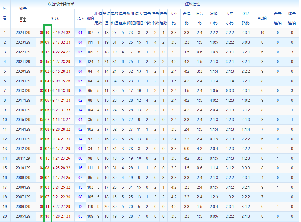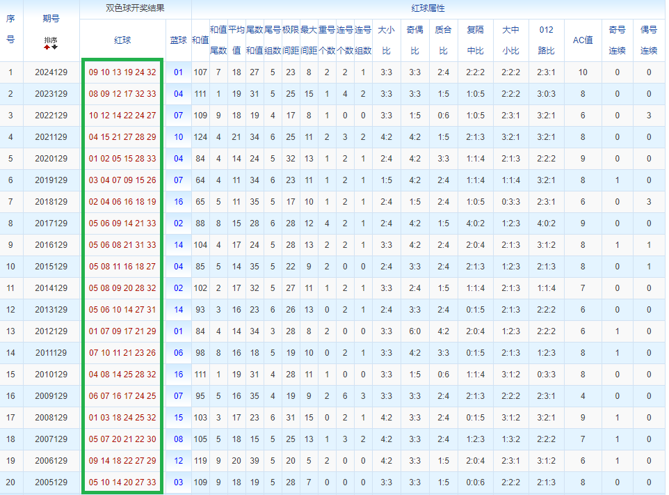 通过观察,我发现双色球往年同期的开奖数据与本期号码之间存在显著关联。具体来说,在红球中,从第一位至第六位,通常会有约4个位置上的数字与往年同期相同位置的号码一致;而蓝球号码中,也有多期开奖结果直接包含了往年同期的数字。因此,我们可以借助往年同期各位置上的号码,作为分析本期开奖情况的重要依据。在此基础上,还可结合往年同期的其他相关条件,进行综合性的号码组合推荐。