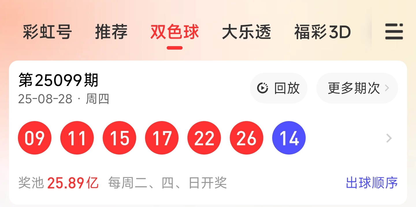 第25099期双色球文章中推荐中命中09,11,15,17,22,26等6个红球。