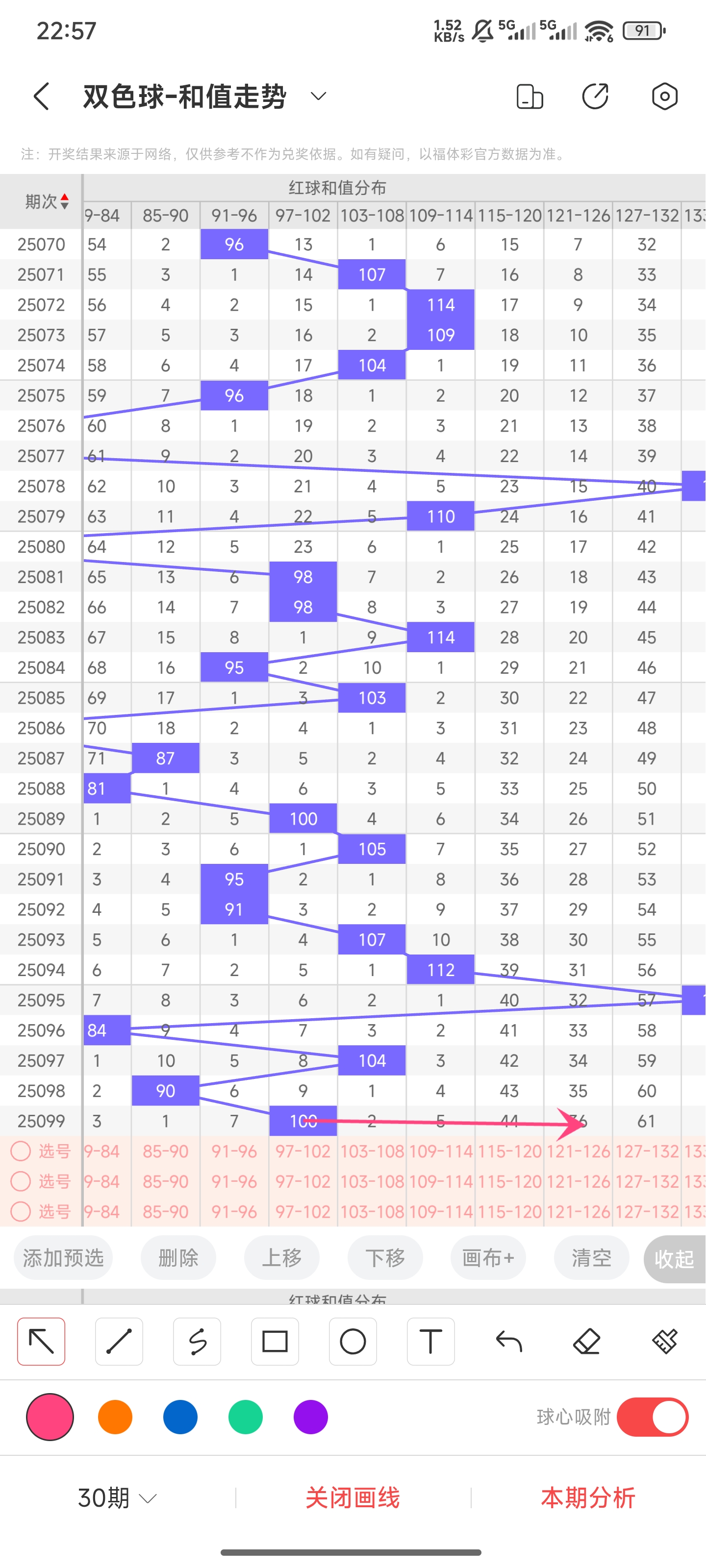 上期和值为100,而近5期和值为134,84,104,90,100均值102.4,上期和值较前一期增加了10,振幅为10。100和值是属于近30期内开出的中间位置的和值,下降的空间和上升的空间差不多,所以可能上升也可能下降,但本期更看好大和值,所以推测本期比较大概率会往右上升,和值变大,小概率继续往左,和值变小。