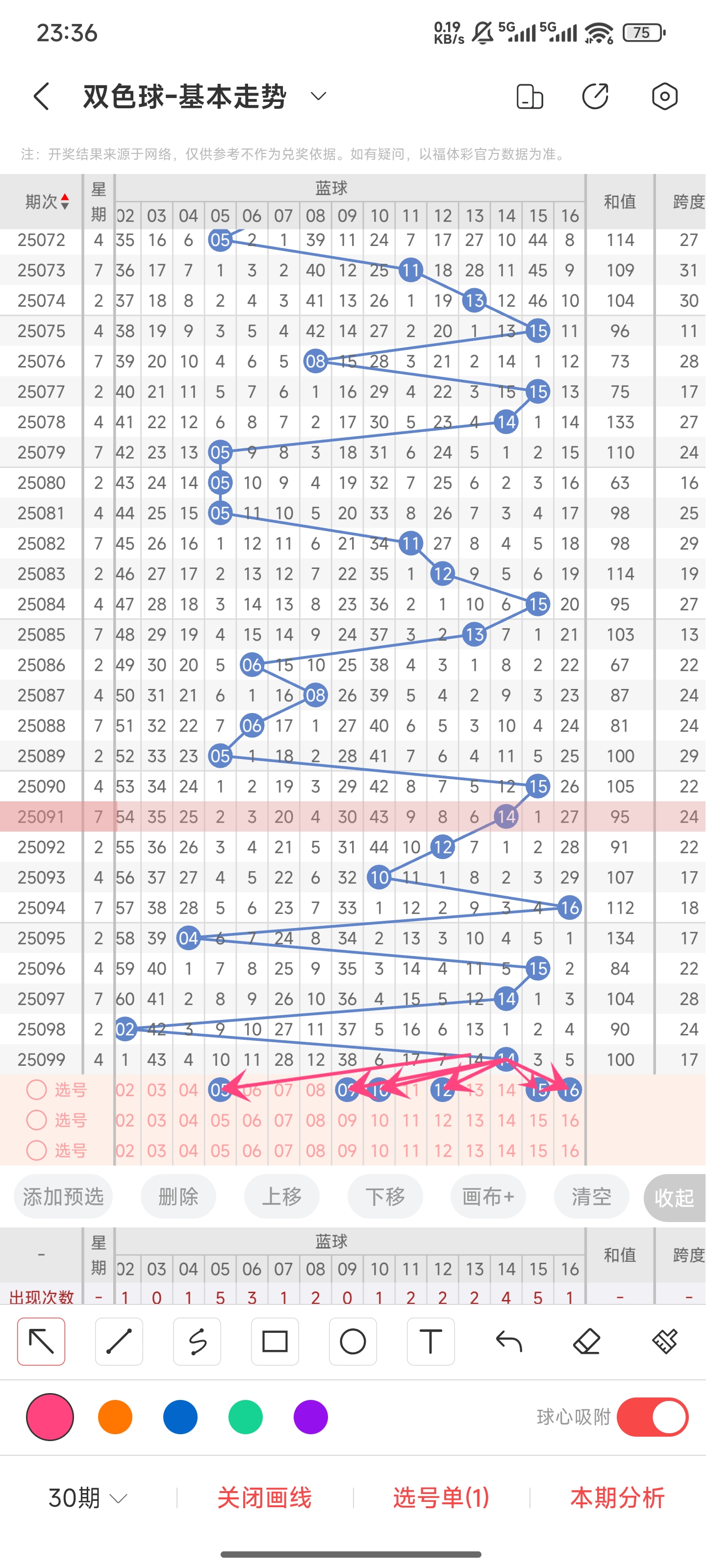 上期开出的是14,往前一期开出的是02。趋势是往右偏移,偏移了12个点,走势很陡。通过分析目前蓝球的走势图最近几期的走势都比较陡,偏移量较大。但已经连续好几期偏移量都比较大了,推测本期有可能会变小一点。但较大的情况也可以防一防。目前的趋势是比较大概率是往左的,小概率往右。结合遗漏期数和冷热号,往右我们可以关注一下15,16,往左我们可以关注05,09,10,12等号码。综上所述本期推测可能开出05,09,10,12,15,16等号码。