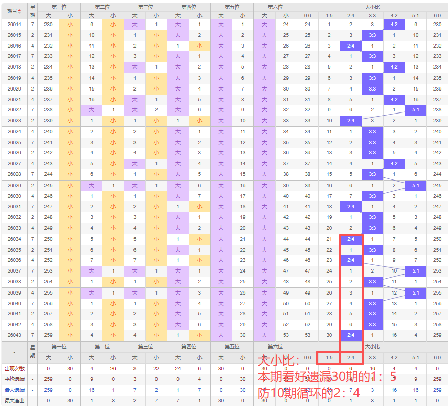 上期大小比:2:4,近10期大小比出现情况:3:3、2:4、3:3、2:4、5:1、3:3、5:1、3:3、3:3、3:3、2:4,最近10期出现5期3:3,出现0期4:2,出3期2:4,出现2期5:1,出现0期1:5,出现0期6:0,出现0期0:6,根据近10期规律本期看好遗漏30期的1:5,防10期循环的2:4,综上所述推荐大小比推荐:2:4,重点关注:1:5。