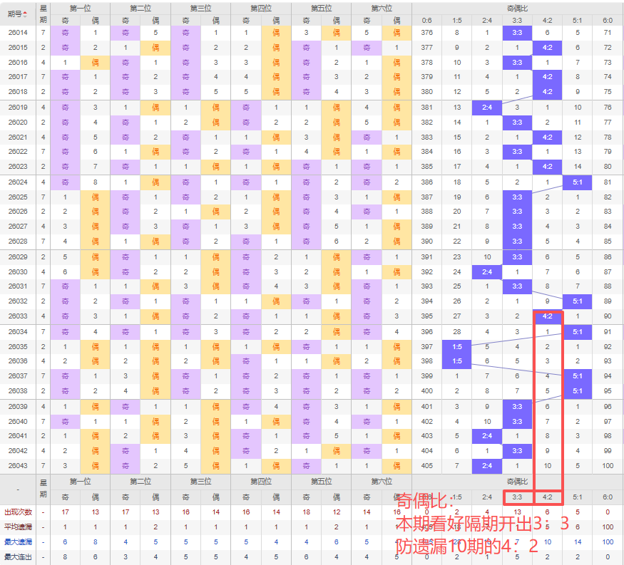 上期奇偶比:2:4,近10期奇偶比出现情况:5:1、1:5、1:5、5:1、5:1、3:3、3:3、2:4、3:3、2:4,最近10期出现3期3:3,出现0期4:2,出现2期2:4,出现3期5:1,出现2期1:5,出现0期6:0,出现0期0:6,根据近10期规律本期看好隔期出3:3,防遗漏10期的4:2,综上所述推荐奇偶比推荐:4:2,重点关注:3:3。