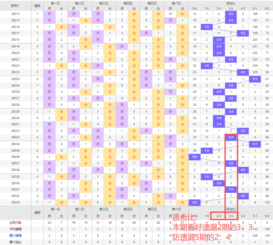 上期质合比:0:6,近10期质合比出现情况:5:1、1:5、0:6、3:3、4:2、1:5、2:4、3:3、4:2、0:6,最近10期出2期3:3,出现2期4:2,出现1期2:4,出现1期5:1,出现2期1:5,出现0期6:0,出现2期0:6,根据近10期规律本期看好遗漏2期3:3,防遗漏3期的2:4,综上所述推荐质合比推荐:2:4,重点关注:3:3。