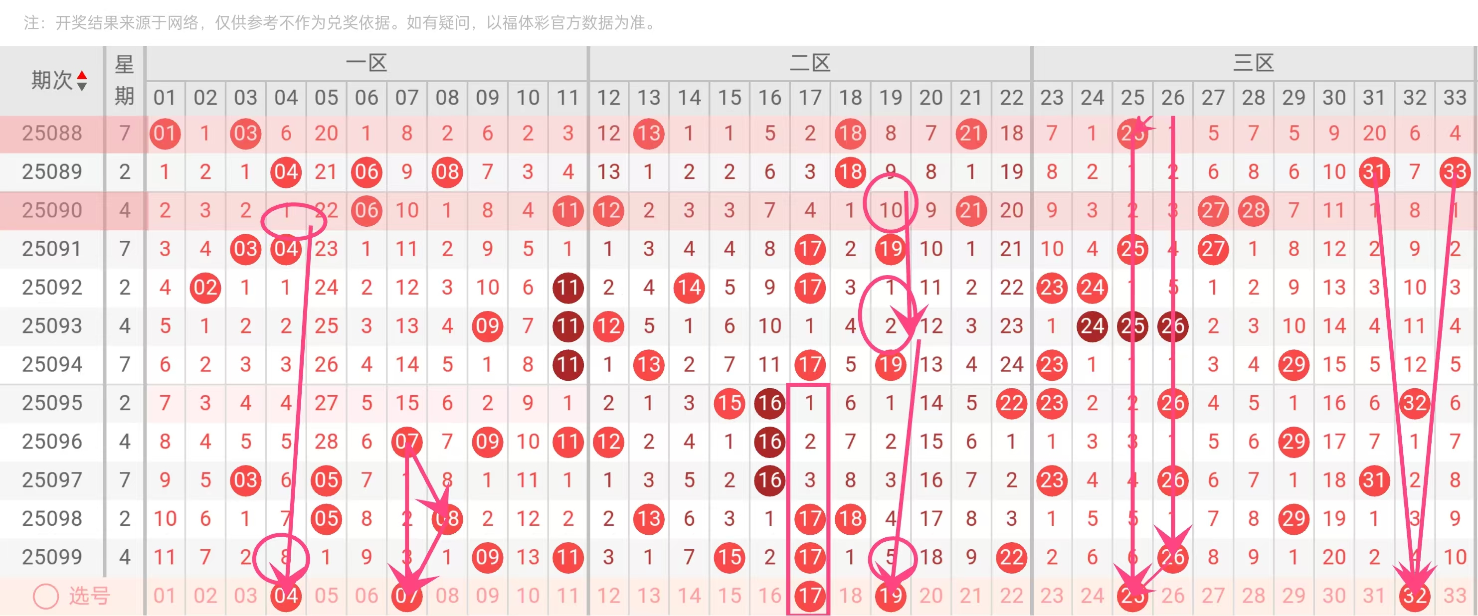 2. 红球包含2个冷号回补(04,32)、2个热号(07,17)、2个趋势号(19,25),冷热搭配科学