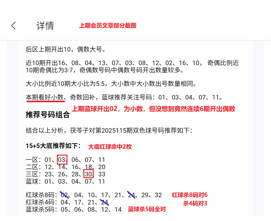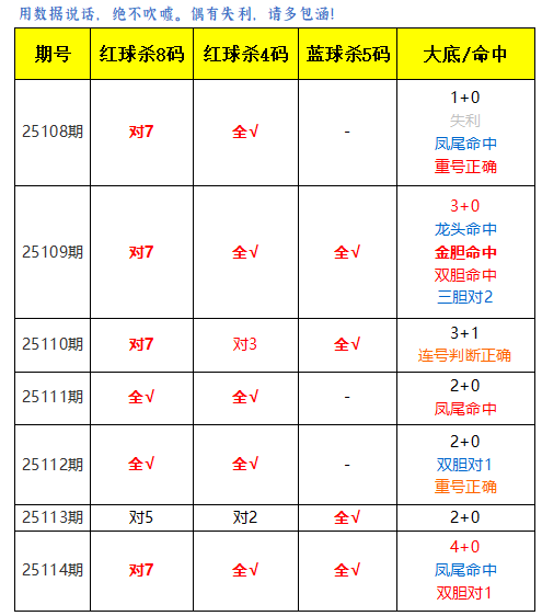 上期红球杀8码对6,免费文章杀4码全对,蓝球杀5码全对,红球命中2枚,本期再接再厉!