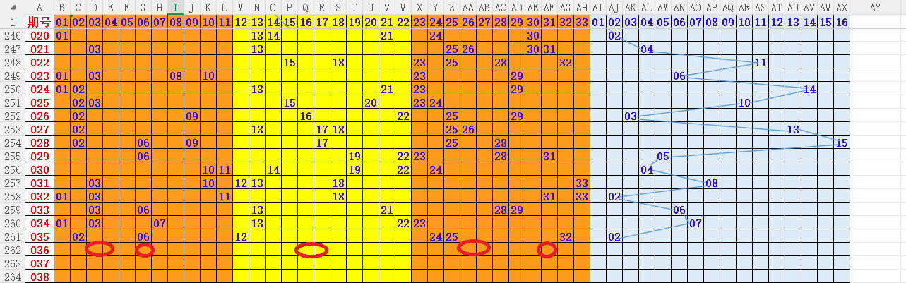 如上图1,区域分析,第一区最低出2个号,重点号码:03 04 06