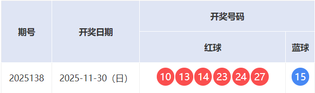上期开奖号码:10 13 14 23 24 27 + 15。