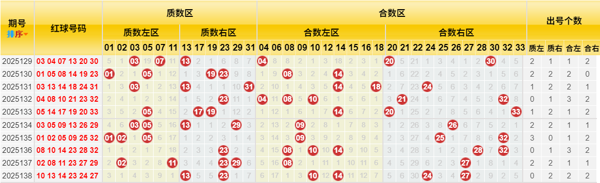 上期红球质合比为2:4,合数继续占据优势。近10期质合比为23:37,合数热度持续。但质数已连续多期弱势,反弹需求逐渐累积。本期预测质数将小幅回补,质合比看好 3:3。