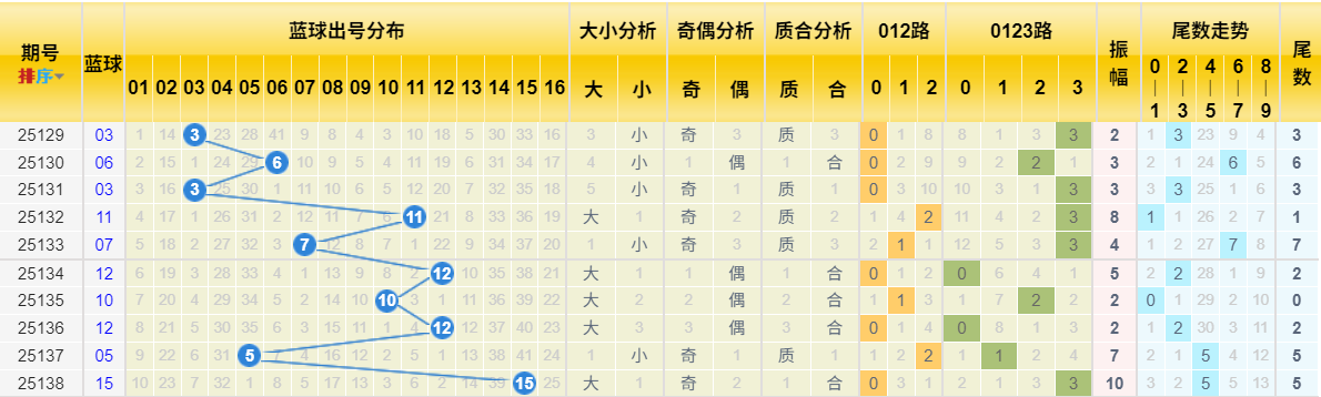 近5期蓝球号码为03 -> 10 -> 12 -> 05 -> 15,在03-15的大区间跳跃。上期开出大号15,本期需防范号码向中小区(01-10)回调,尤其关注其中的1路和2路号码。