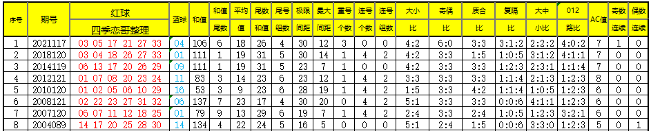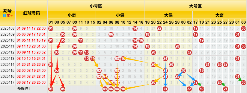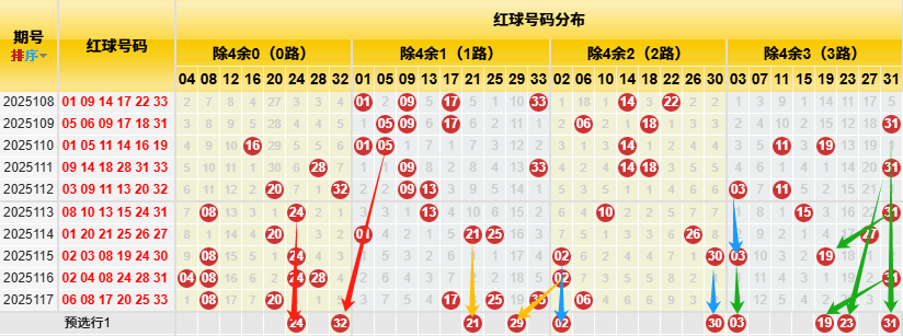 【数据参数】根据前区除4余数,组合成上图分别为余0路(简称0路)4、8、12、16、20、24、28、32);余1路(简称1路)1、5、9、13、17、21、25、29、33;余2路(简称2路)2、6、10、14、18、22、26、30;余3路(简称3路)3、7、11、15、19、23、27、31。