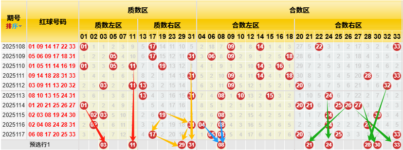 【数据参数】 根据前区质合小大属性,组合成上图质数区1、2、3、5、7、11、13、17、19、23、29、31和合数区4、6、8、9、10、12、14、15、16、18、20、21、22、24、25、26、27、28、30、32、33,质数区分为质数左区1、2、3、5、7、11和质数右区13、17、19、23、29、31;合数区分为合数左区4、6、8、9、10、12、14、15、16、18)和合数右区20、21、22、24、25、26、27、28、30、32、33。