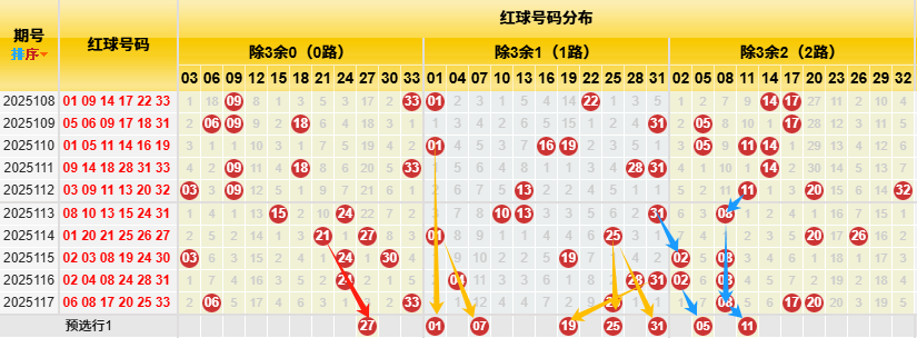 【数据参数】 根据前区除3余数,组合成上图分别为余0路(简称0路)3、6、9、12、15、18、21、24、27、30、33;余1路(简称1路)1、4、7、10、13、16、19、22、25、28、31; 余2路(简称2路)2、5、8、11、14、17、20、23、26、29、32。