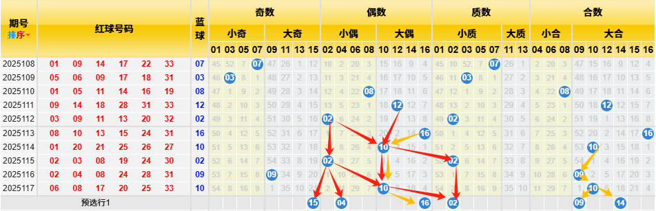 根据蓝球近十期数据统计:小奇数出现2次,大奇数出现1次,小偶数出现3次,大偶数出现4次,小质数出现4次,大质数出现0次,小合数出现1次,大合数出现5次。从上述数据可以看出偶回补到位后,今日要注意奇数咯;再来看历史数据统计,小奇数出现850次,大奇数出现852次,小偶数出现806次,大偶数出现754次,小质数出现820次,大质数出现413次,小合数出现609次,大合数出现892次,从上述数据可以看出小奇数、大偶数、小质数、小合数历史数据占优,上期命中合数和偶数,结合近十期数据对比,本期可能要出现质数回补的局面,故本期结合上述数据并根据斜率对称原理看好15 04 16 02 09 14