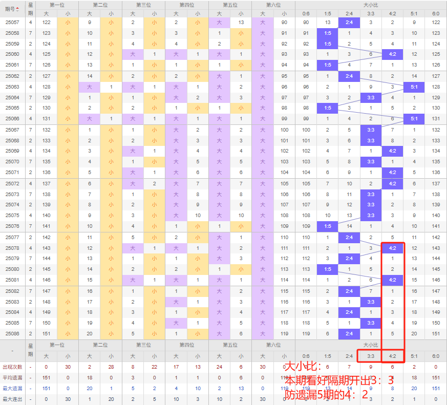 上期大小比:2:4,近10期大小比出现情况:2:4、4:2、2:4、1:5、4:2、2:4、3:3、2:4、3:3、2:4,最近10期出现1期3:3,出现3期4:2,出5期2:4,出现0期5:1,出现1期1:5,出现0期6:0,出现0期0:6,根据近10期规律本期看好隔期开出3:3,防遗漏5期的4:2,综上所述推荐大小比推荐:4:2,重点关注:3:3。