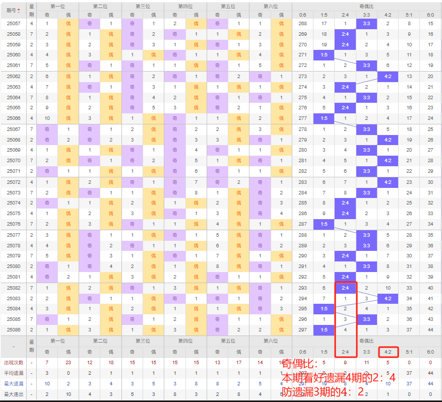 上期奇偶比:1:5,近10期奇偶比出现情况:3:3、3:3、2:4、3:3、2:4、2:4、4:2、1:5、3:3、1:5,最近10期出现5期3:3,出现1期4:2,出现3期2:4,出现0期5:1,出现2期1:5,出现0期6:0,出现0期0:6,根据近10期规律本期看好遗漏4期的2:4,防遗漏3期的4:2,综上所述推荐奇偶比推荐:4:2,重点关注:2:4。
