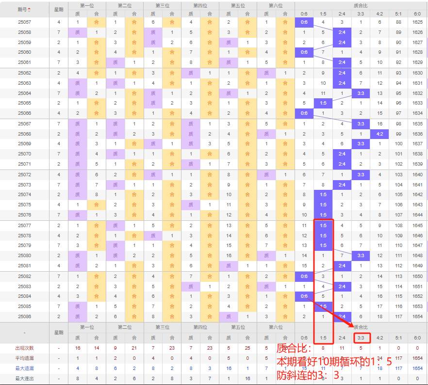 上期质合比:2:4,近10期质合比出现情况:1:5、1:5、1:5、3:3、2:4、0:6、2:4、0:6、1:5、2:4,最近10期出1期3:3,出现0期4:2,出现3期2:4,出现0期5:1,出现4期1:5,出现0期6:0,出现2期0:6,根据近10期规律本期看好10期循环的1:5,防斜连的3:3,综上所述推荐质合比推荐:3:3,重点关注:1:5。