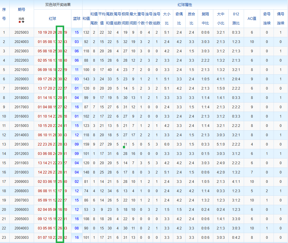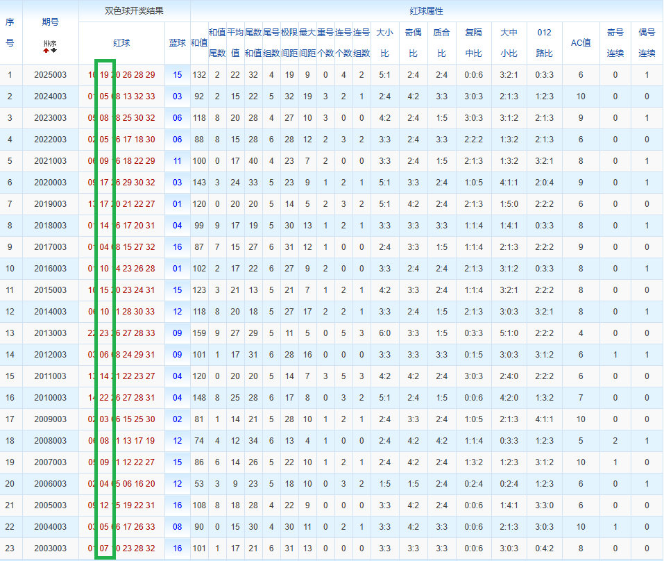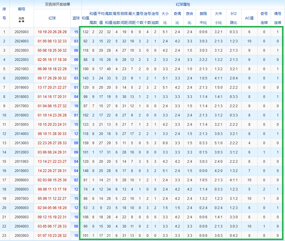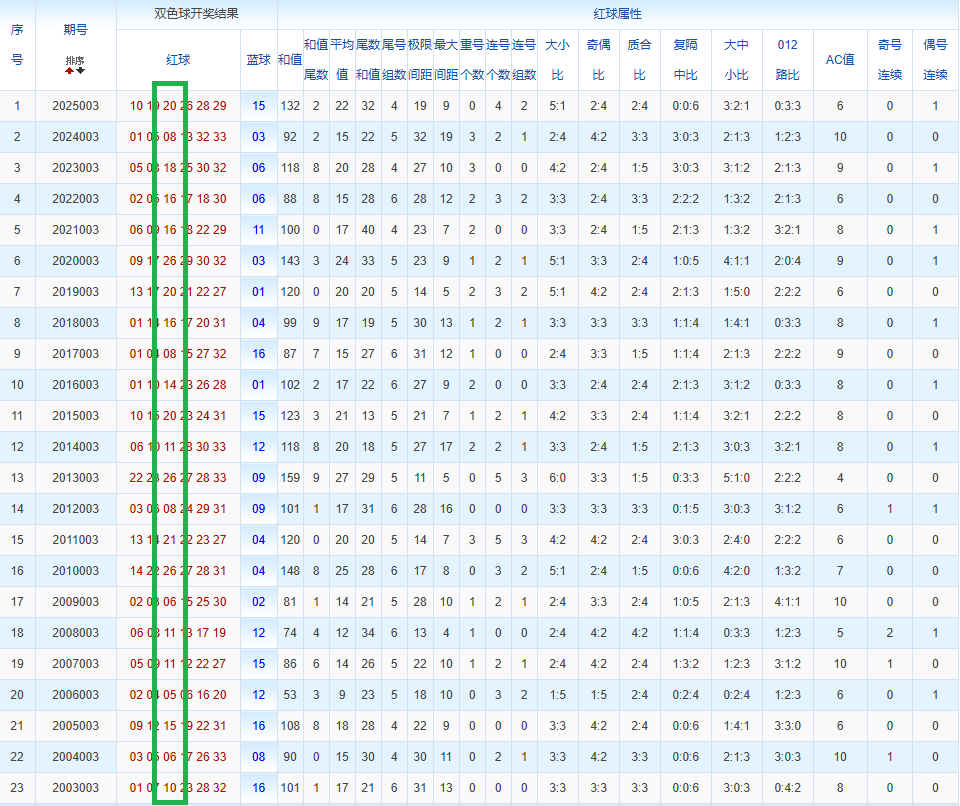 通过观察,我发现双色球往年同期的开奖数据与本期号码之间存在显著关联。具体来说,在红球中,从第一位至第六位,通常会有约4个位置上的数字与往年同期相同位置的号码一致;而蓝球号码中,也有多期开奖结果直接包含了往年同期的数字。因此,我们可以借助往年同期各位置上的号码,作为分析本期开奖情况的重要依据。在此基础上,还可结合往年同期的其他相关条件,进行综合性的号码组合推荐。