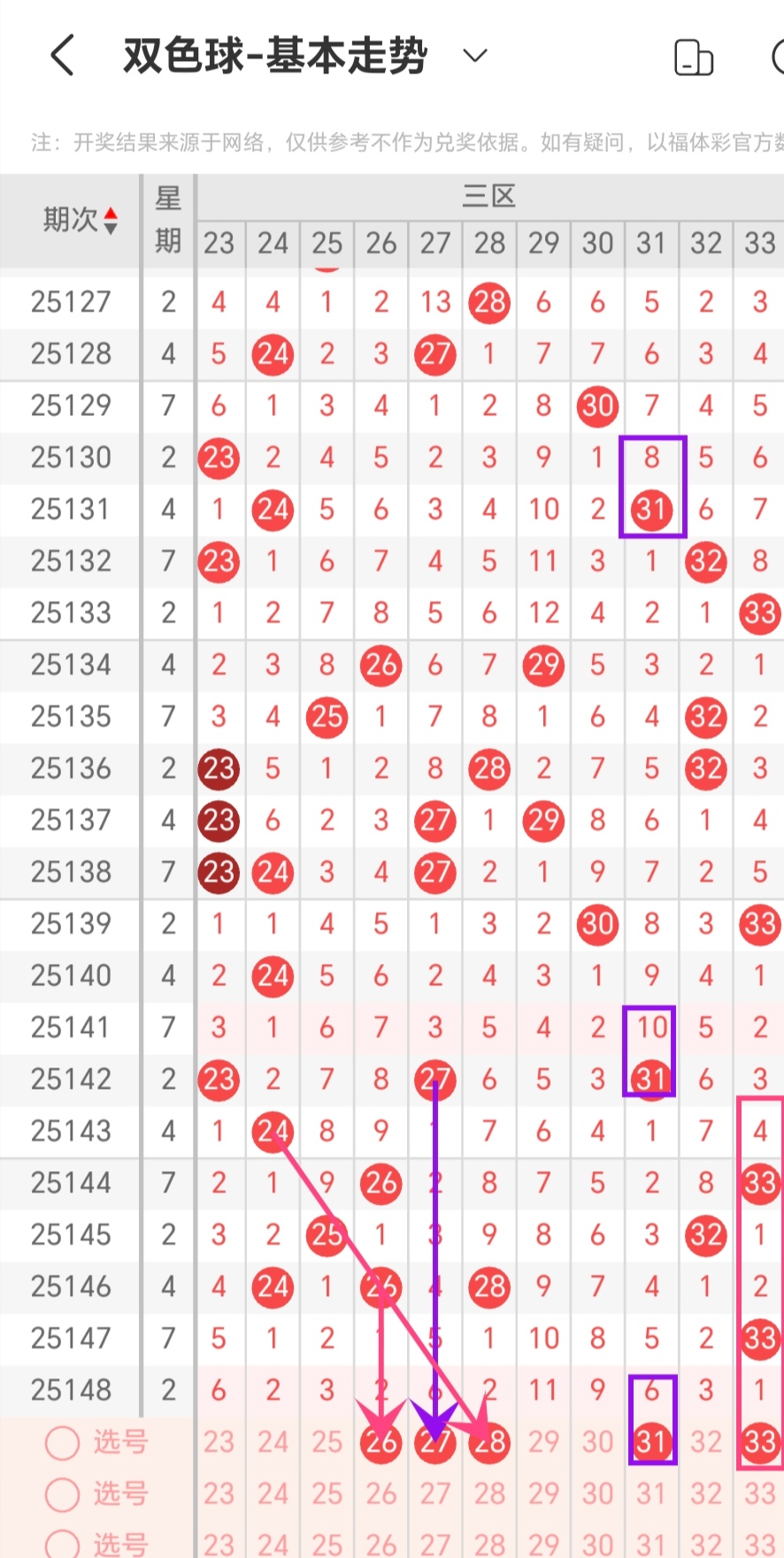 通过对同星期周四重号出现数量规律进行统计分析,本期考虑出号1-2个,即05-07-12-24-26-28出号1-2个