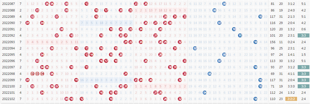 上期奇偶比为2:4,偶数较热,近10期奇偶比为28:32,奇偶红球持平,本期预计奇偶号码继续平衡,关注奇偶比3:3。
