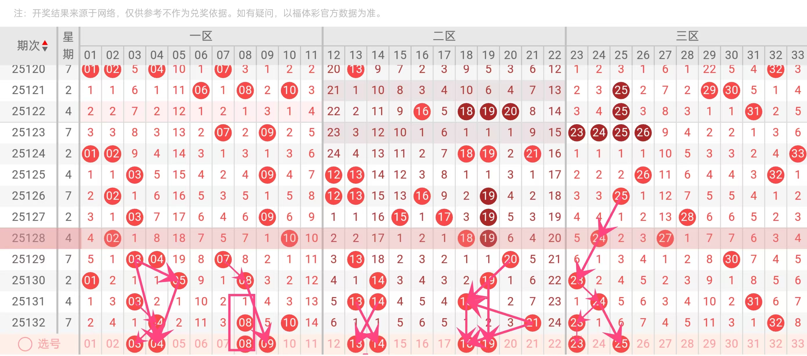 区间分布:将红球分为1-11、12-22、23-33三个区间。近5期奖号在12-22区间较为集中。我选择的号码中,1-11区间有03、04、08、09(4个),12-22区间有13、14、18、19(4个),23-33区间有23、25(2个),分布均衡,覆盖了热点区间。