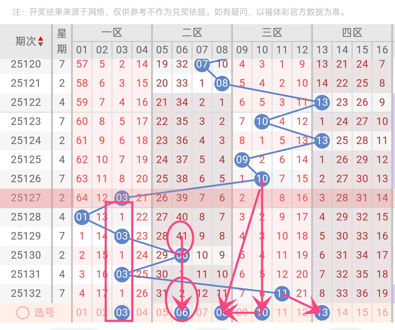 历史规律:蓝球选择避免了极冷号(如05、14、15),专注于热号和温号。03和13作为热号,概率较高;06和08遗漏适中,可能开出;10作为高频号,遗漏后回归可能性大。