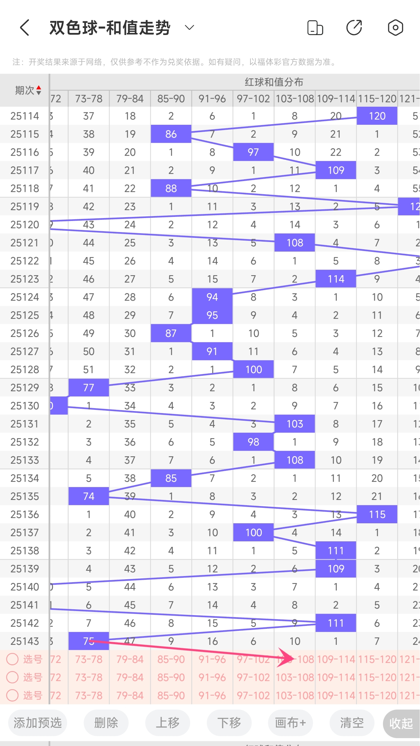 上期和值为75,而近5期和值为109,62,46,111,75,上期和值较前一期减少了36,振幅为36。75和值是属于近30期内开出的比较小的和值,上升的空间比较大,下降的空间比较小。本期看好和值变大,所以推测本期和值趋势是大概率往右,和值变大,小概率往左,和值变小。