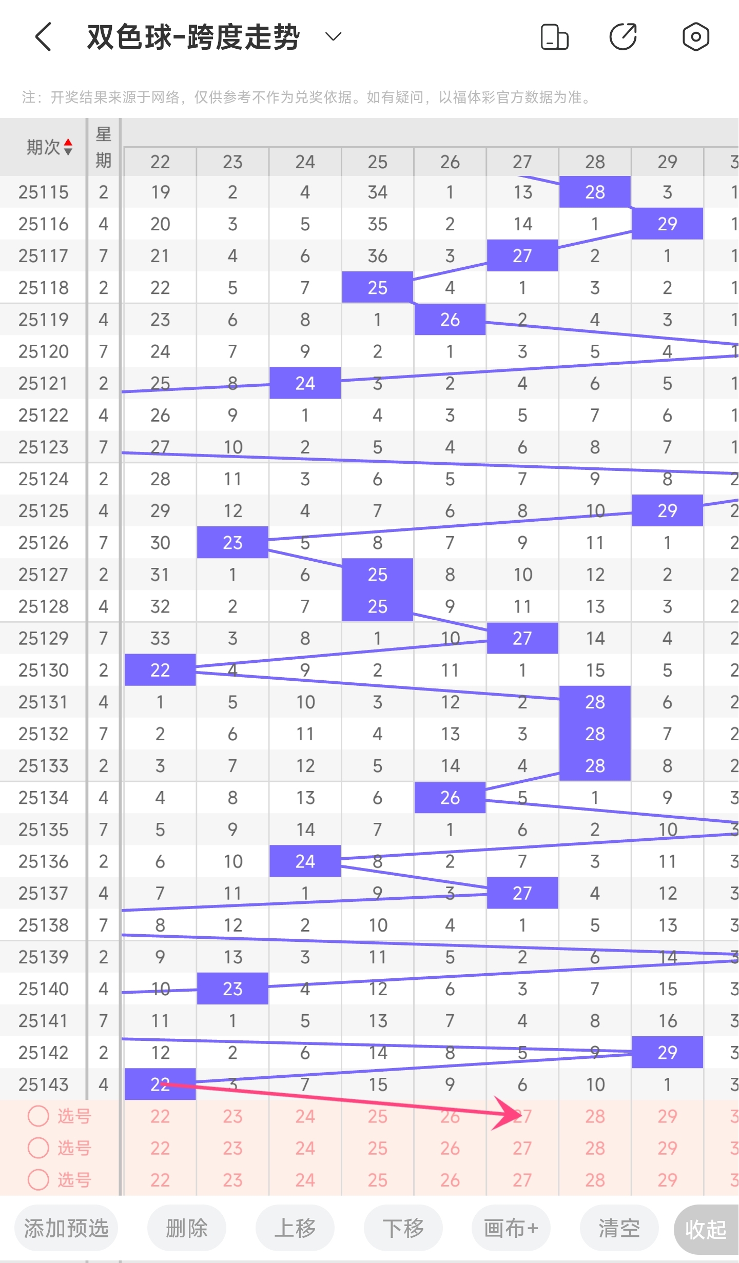 上期龙头为2,凤尾为24,跨度为22,往前一期跨度是29,偏移量为7。22跨度值是30期内开出的比较小跨度值。上升的空间比较大,下降的空间比较小,本期看好跨度变大,所以推测本期跨度趋势是往右的,跨度变大。