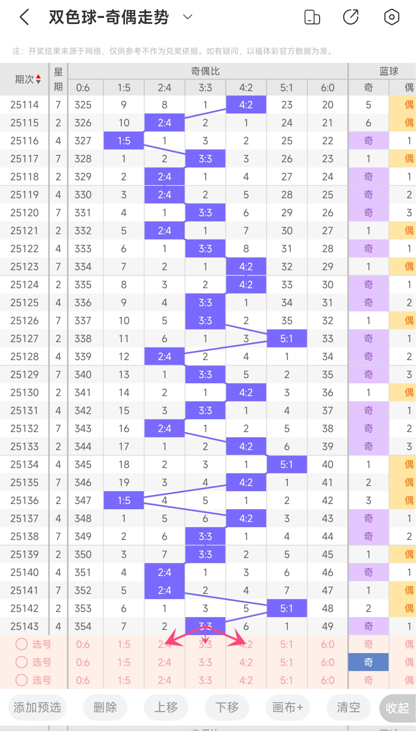 上期奇偶比为3:3,分别为偶奇偶奇奇偶。往前一期奇偶比为5:1。通过近30期内奇偶走势的数据分析,目前1:5奇偶比开出的概率是6.66%,5:1奇偶比开出的概率是10%,3:3奇偶比开出的概率是33.33%,4:2奇偶比开出的概率是23.33%,2:4奇偶比开出的概率是26.66%,6:0奇偶比开出的概率是0%。与前一期相比,概率没有发生变化。通过分析走势图,上期开了3:3奇偶比,本期有可能继续开出。所以本期推测本期可能开3:3奇偶比,其次是2:4奇偶比或者4:2奇偶比,最后是1:5和5:1奇偶比。