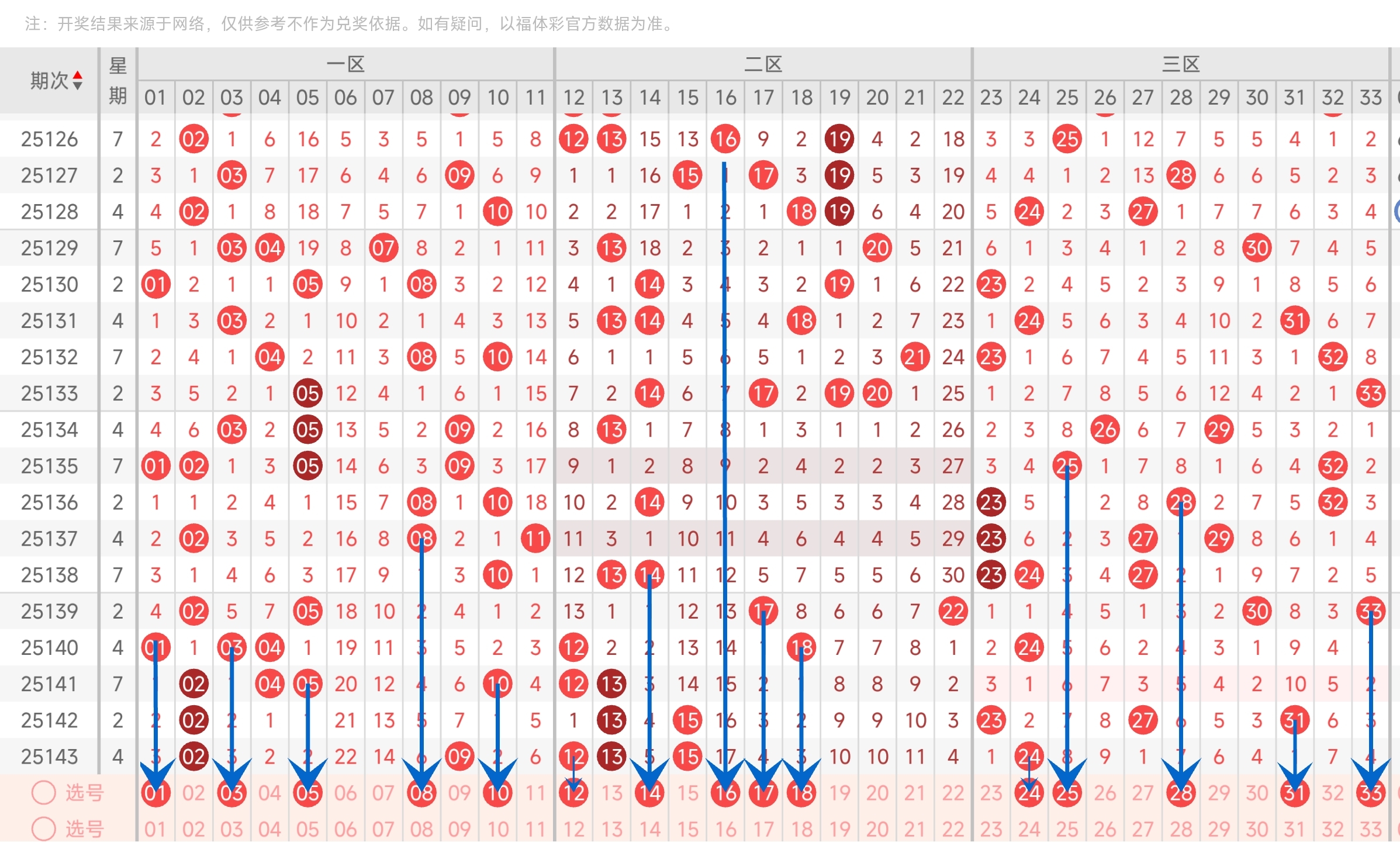 上一期三区开出了24号球。往前一期开出了23,27,31号球。通过走势图分析,可以看到上期开了24,在左边位置,推测本期有可能往右边开,但左边的号码也可能继续开出,所以本期我们均匀关注左中右的号码。最后再结合冷热号和遗漏期数,本期我们可以关注24,25,28,31,33等号。综上所述本期我们推测有可能开出24,25,28,31,33等号码。