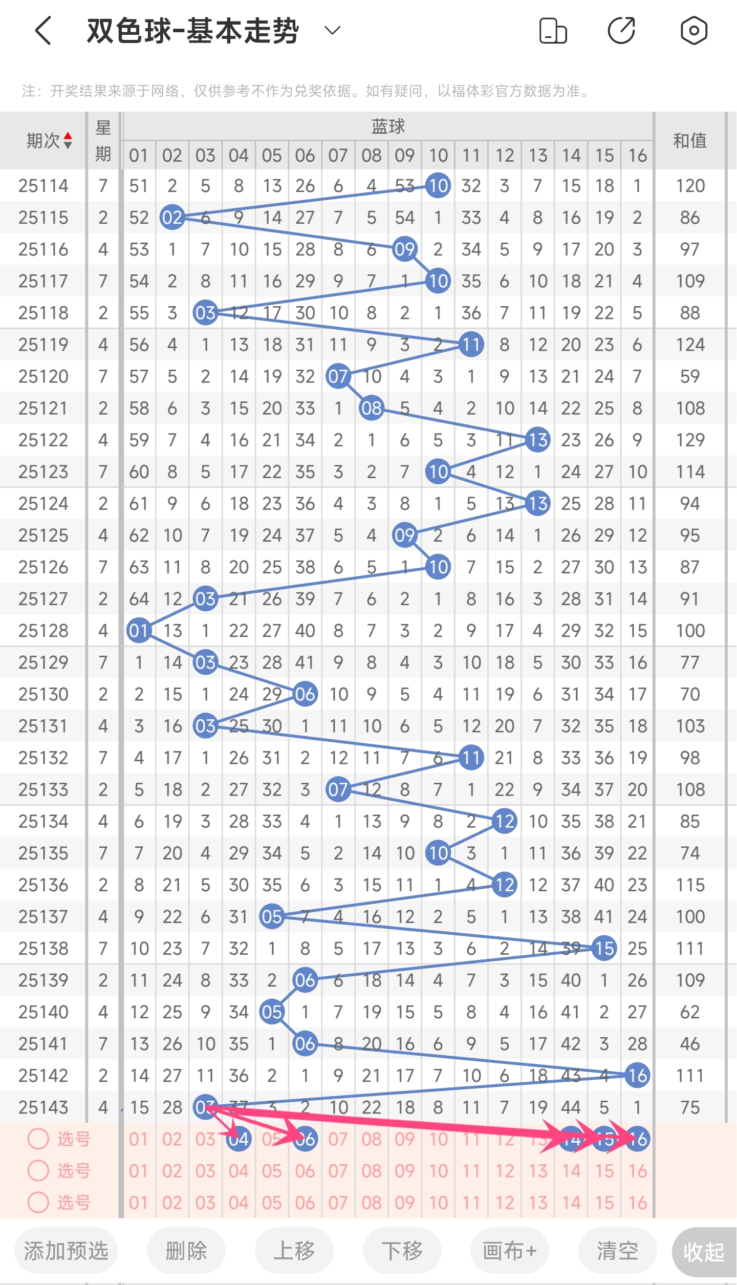 上期开出的是3,往前一期开出的是16。趋势往左偏移,偏移量为13,偏移量很大。通过分析目前蓝球的走势图,目前的趋势是大概率往右的,小概率往左,本期看好往右开。从偏移量来看,近2期偏移量都是很大的,本期有可能继续开大偏移量的号码,防偏移量又突然变小。最后再结合遗漏期数,以及冷热号,本期我们可以关注4,6,14,15,16等号码。综上所述本期推测可能开出4,6,14,15,16等号码。