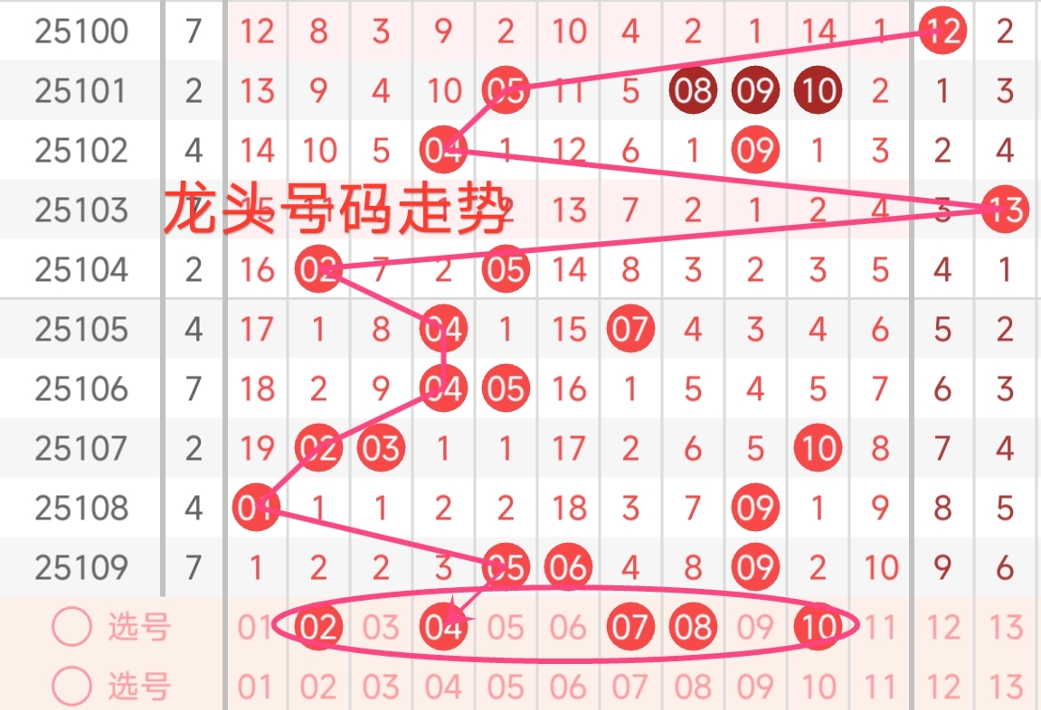 上期龙头号码为05,振幅上升了4点,开出奇数号码。从近期龙头号码走势来看,近期龙头号码波动频繁。回顾近期龙头号码,大多集中在01 - 10区间。上期龙头为05,处于该区间中部。结合走势来看,本期龙头可能会继续在这个区间内产生,且有可能向区间前端靠拢,预计本期龙头号码关注 01 - 10之间。本期还需关注遗漏值较高的号码,本期有望龙头号码热出的区域。综合考虑,本期龙头号码可重点关注02、04、07、08、10。