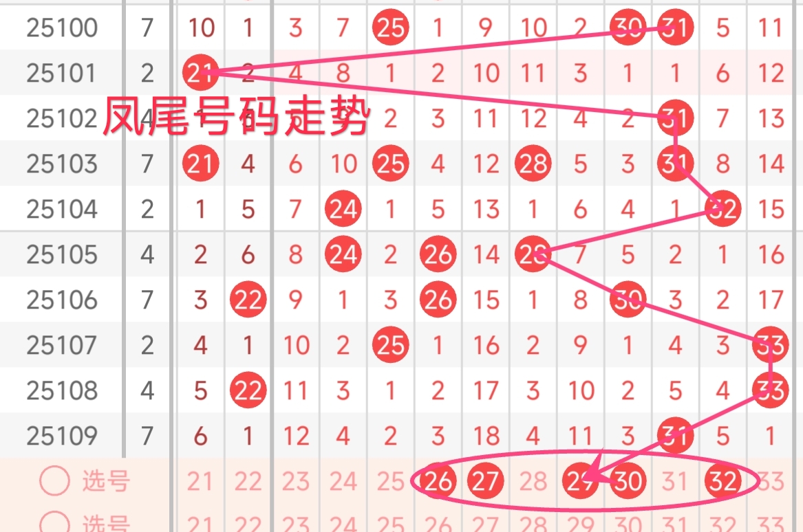 上期凤尾号码为31,振幅下降了2点,开出了奇数号码。回顾近期凤尾号码,振幅波动较大。上期凤尾号码是31,处于高位。从近期凤尾走势分析,号码多在红三区高位区间。本期预计凤尾依然会维持在高位区间,本期凤尾号码推荐关注 26-33区间。本期还需注意一些连续漏出的号码有望在本期热出。本期凤尾号码可重点关注26、27、29、30、32。