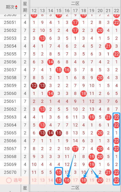 根据走势图可以看出当前区段,061期没有开出号码球,062期没有开出13一个号码球,063期没有开出19.21.22三个号码球,064期开出了13.22二个号码球,065期开出了13.14.15.20四个号码球,066期开出了22一个号码球 ,067期开出了17.20.22三个号码球,068期开出了19.20二个号码球,069期开出了19一个号码球,070期开出了15.21.22三个号码球,按照如此规律本期当前区可能开出1单1双。我们看下当前区上期没有开出重叠号,那么本期当前区要定重叠号的情况下可关注22号码球。再看下当前区上期开出19斜连号,当期选号得留意斜连20号码球。本区重点关注15.16.20.22