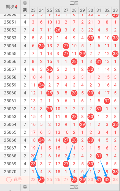 根据走势图可以看出当前区,061期开出了32一个号码球,062期开出了25.31二个号码球,063期开出了28.30二个号码球,064期开出来29.33二个号码球,065期没有开出号码球,066期开出了24.27.28.30四个号码球,067期没有开出号码球 ,068期开出了31一个号码球,069期开出了23.27.30三个号码球,070期开出了33一个号码球,按照如此规律判断本期当前区可能开出1单1双。我们看下当前区上期没有开出重叠号,那么本期当前区要定重叠号的情况下可关注33号码球。再看下当前区上期没有开出斜连号,当期选号得留意32斜连号。本区重点关注24.28.31.32