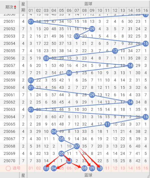 根据走势图近10期的走势看,蓝球在057期开出14蓝球之后,3小2大1小2大4小,再看下近10期的蓝球中冷码有回补的趋势,这种趋势规律本期判断极有可能开出冷码小号,本期防蓝球04小号,蓝球本期重点关注03.08.09.10