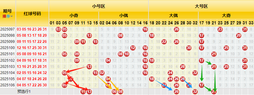 1、小大奇偶交叉图(小奇数红色箭标、小偶数黄色箭标、大偶数蓝色箭标大奇数绿色箭标