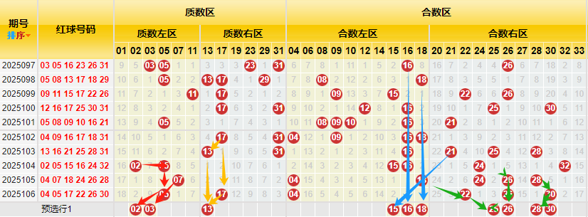 【数据参数】 根据前区质合小大属性,组合成上图质数区1、2、3、5、7、11、13、17、19、23、29、31和合数区4、6、8、9、10、12、14、15、16、18、20、21、22、24、25、26、27、28、30、32、33,质数区分为质数左区1、2、3、5、7、11和质数右区13、17、19、23、29、31;合数区分为合数左区4、6、8、9、10、12、14、15、16、18)和合数右区20、21、22、24、25、26、27、28、30、32、33。