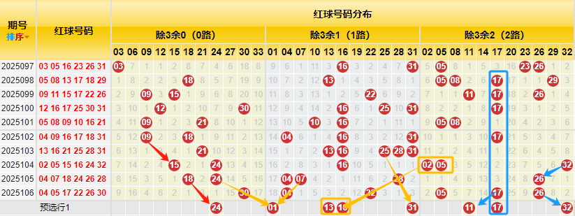 【数据参数】 根据前区除3余数,组合成上图分别为余0路(简称0路)3、6、9、12、15、18、21、24、27、30、33;余1路(简称1路)1、4、7、10、13、16、19、22、25、28、31; 余2路(简称2路)2、5、8、11、14、17、20、23、26、29、32。