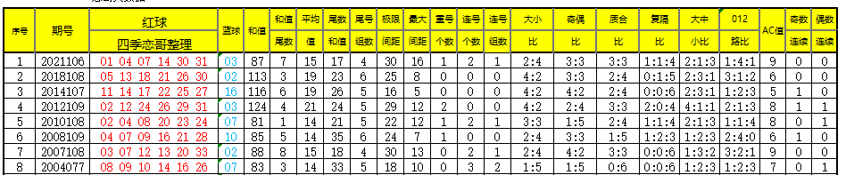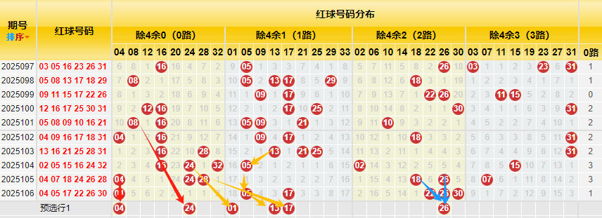 【数据参数】根据前区除4余数,组合成上图分别为余0路(简称0路)4、8、12、16、20、24、28、32);余1路(简称1路)1、5、9、13、17、21、25、29、33;余2路(简称2路)2、6、10、14、18、22、26、30;余3路(简称3路)3、7、11、15、19、23、27、31。