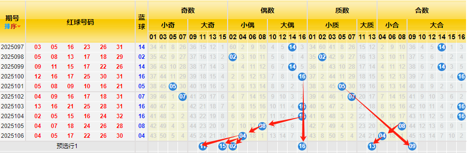 根据蓝球近十期数据统计:小奇数出现2次,大奇数出现0次,小偶数出现2次,大偶数出现5次,小质数出现3次,大质数出现0次,小合数出现2次,大合数出现5次。从上述数据可以看出看出小质数、大合数处于极热状态正在转冷,本期关注大质数和合数回补;再来看历史数据统计,小奇数出现848次,大奇数出现850次,小偶数出现803次,大偶数出现750次,小质数出现816次,大质数出现412次,小合数出现608次,大合数出现888次,从上述数据可以看出小奇数、大偶数、小质数、小合数历史数据占优,结合近十期数据对比,因此短期内关注合数和奇数持续大热,故本期结合上述数据并根据斜率对称原理看好11 15 02 16 13 09