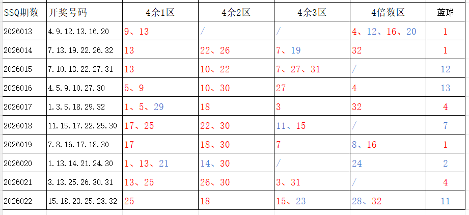分享第一个数据分析:四分区统计数据。相对于传统的三分区,个人习惯使用四分区,就是把33个红球号码除以4,所得的余数分区如下: