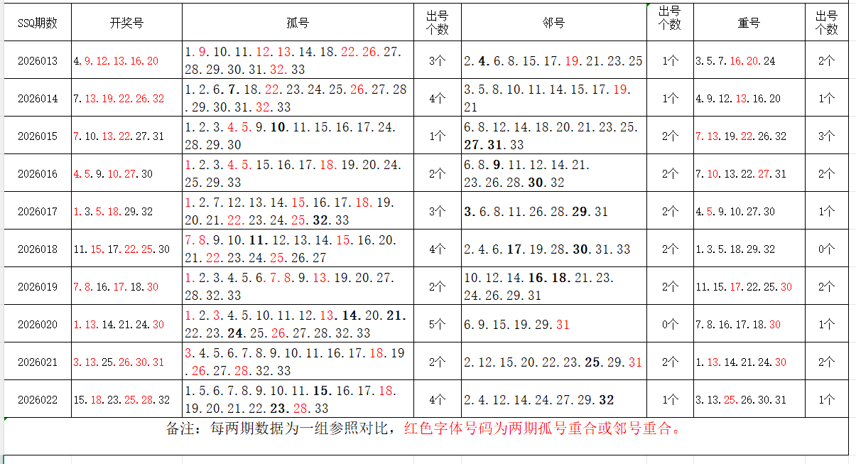 如图,以近两期数据为一组,进行对比分析。相同的孤号、邻号,可能在下期出1-4个左右。上期开出孤号4个,邻号1个,重号1个。本期参考孤号:1.2.3.4.5.6.7.8.9.10.11.12.13.20.21.30;邻号:14.16.17.19.22.24.26.27.29.31.33;孤、邻号重合号码精选:***(会员专区可见)。个人分析,仅供参考。