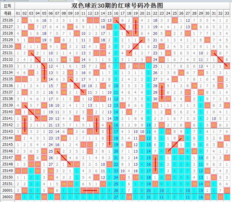 双色球近30期的红球号码冷热图 (数字为遗漏期数,蓝色标记的为遗漏超过10期的大冷号)