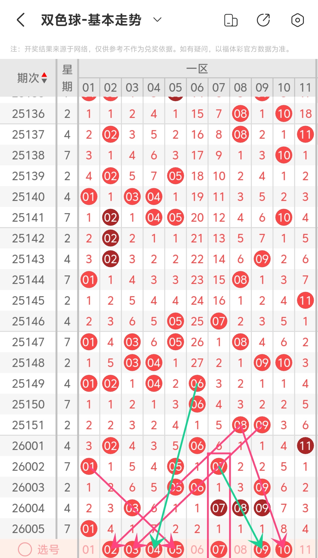 下面是我对2026006期福彩双色球的分析和预判,希望通过我的分析能让大家今晚大红!福彩双色球上期开奖号码如下图: