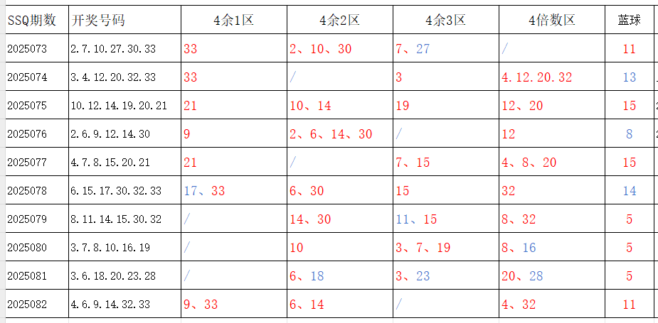 分享第一个数据分析:四分区统计数据。相对于传统的三分区,个人习惯使用四分区,就是把33个红球号码除以4,所得的余数分区如下: