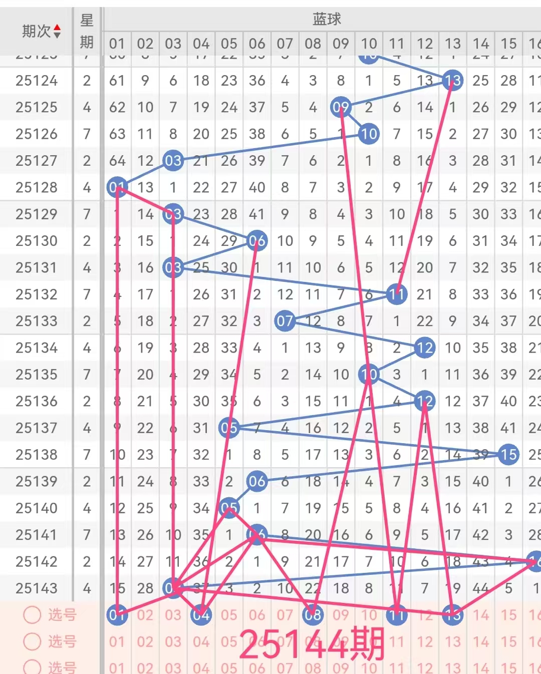 7.蓝球分析:上期蓝球开出03,本期重点关注蓝球号01、04、08、11、13