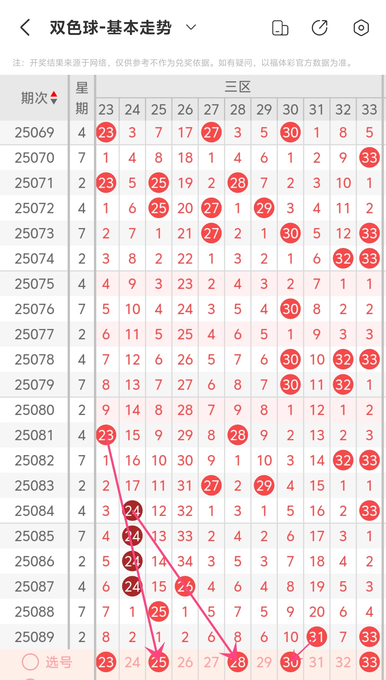 上期第三区间开出31 33,本期我们可以从上面走势图中看到选号的思路,25为斜连走势,28为斜连走势,30为分边走势,综合以上分析本期第三区间推荐23 25 28 30 33