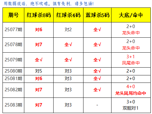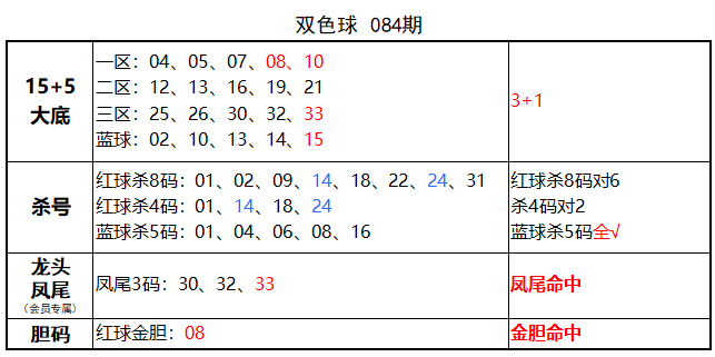 上期红球杀8码对6,免费文章杀4码对2,蓝球杀5码全对,金胆命中,凤尾命中,大底命中3+1,本期再接再厉!