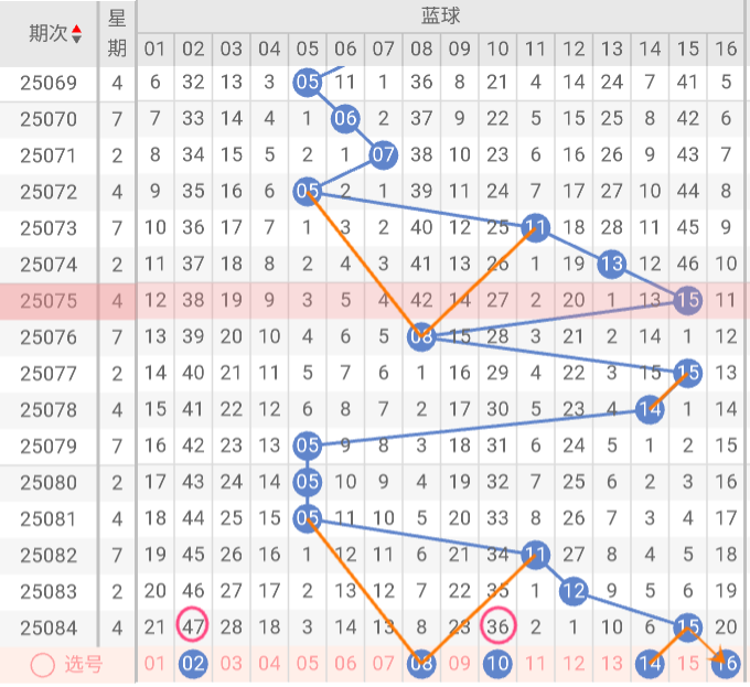 结合以上因素,本期蓝球推荐关注号码:02、08、10、14、16。