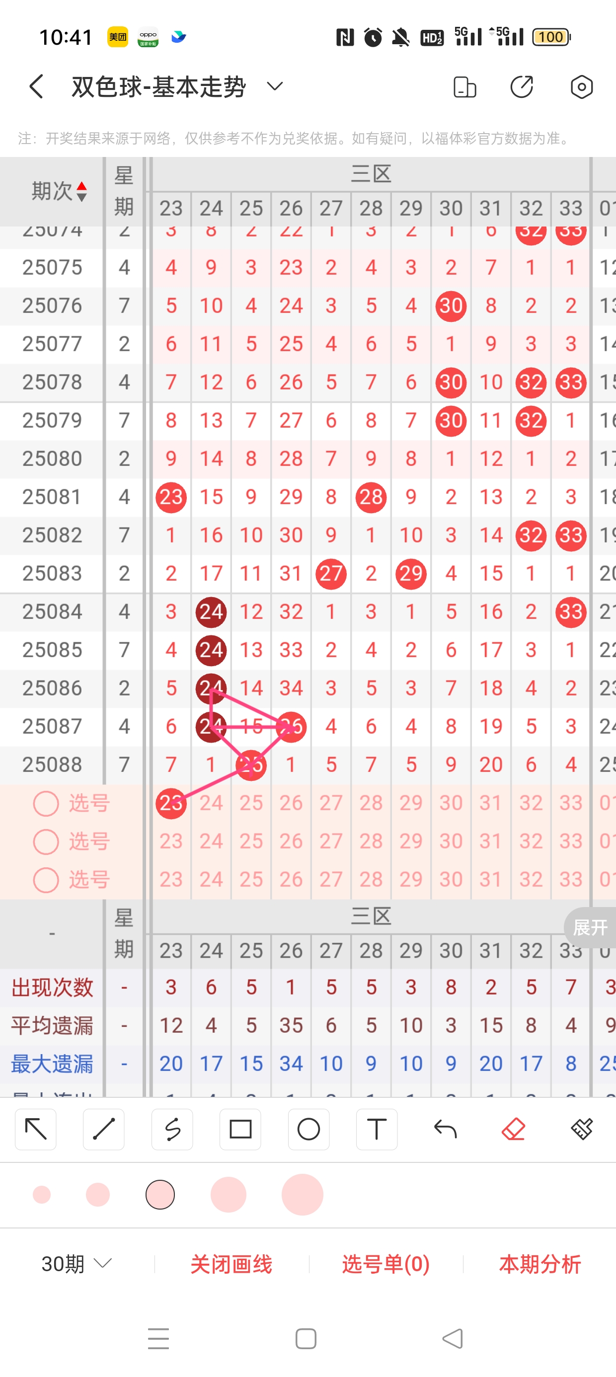 三区(23-33)近86期本区邻孤传38邻73孤6传,孤号热度高,本期着重邻传。近86期本区012路45:36:42,0/2路热度高,本着重1路。23已遗漏7期,与25之间呈现向左遗漏递减态势,需防。